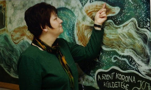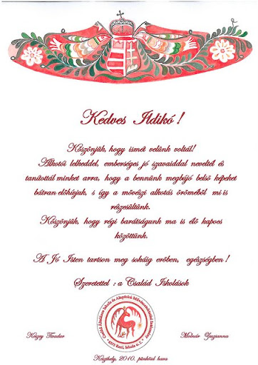 Ildikó segítségével készítettük el az iskola nappalijában látható „napkaput” (a régi kazettás templomi mennyezetek mintájára), vele készítettük a néptánccsoportok zászlóit, valamint az ő táborában batikoltuk 15 évvel ezelőtt az iskola rovásírásos zászlóját. Ildikótól nem csak textilfestési technikai ismereteket szereztünk, hanem abban is segített, hogy miképpen alkossunk képet a kifejezni akart mondanivalónkból.